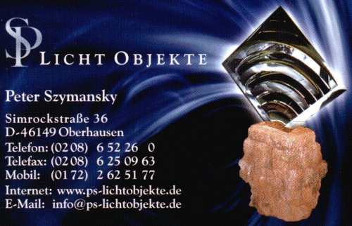 Senden Sie E-Mail mit Fragen oder Kommentaren zu dieser Website an: webmaster@ps-lichtobjekte.de